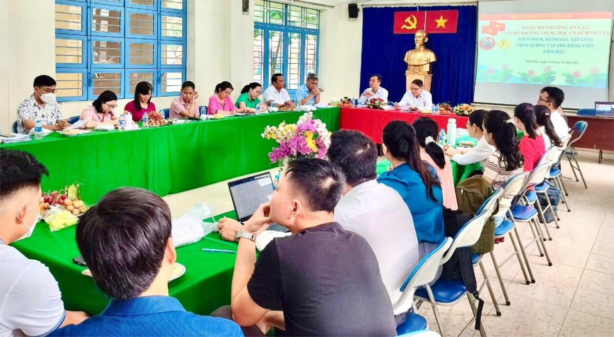 Thực hiện Kế hoạch số 134-KH/ĐU ngày 11 tháng 12 năm 2023 của Đảng ủy phường An Lạc về việc tổ chức, kiểm điểm và đánh giá, xếp loại chất lượng hàng năm đối với tập thể, cá nhân trong hệ thống chính trị phường An Lạc; sáng ngày 23 tháng 12 năm 2023, Chi bộ Trường THCS Bình Tân đã tiến hành tổ chức kiểm điểm và đánh giá xếp loại chất lượng hằng năm đối với tập thể, cá nhân Đảng viên năm 2023.