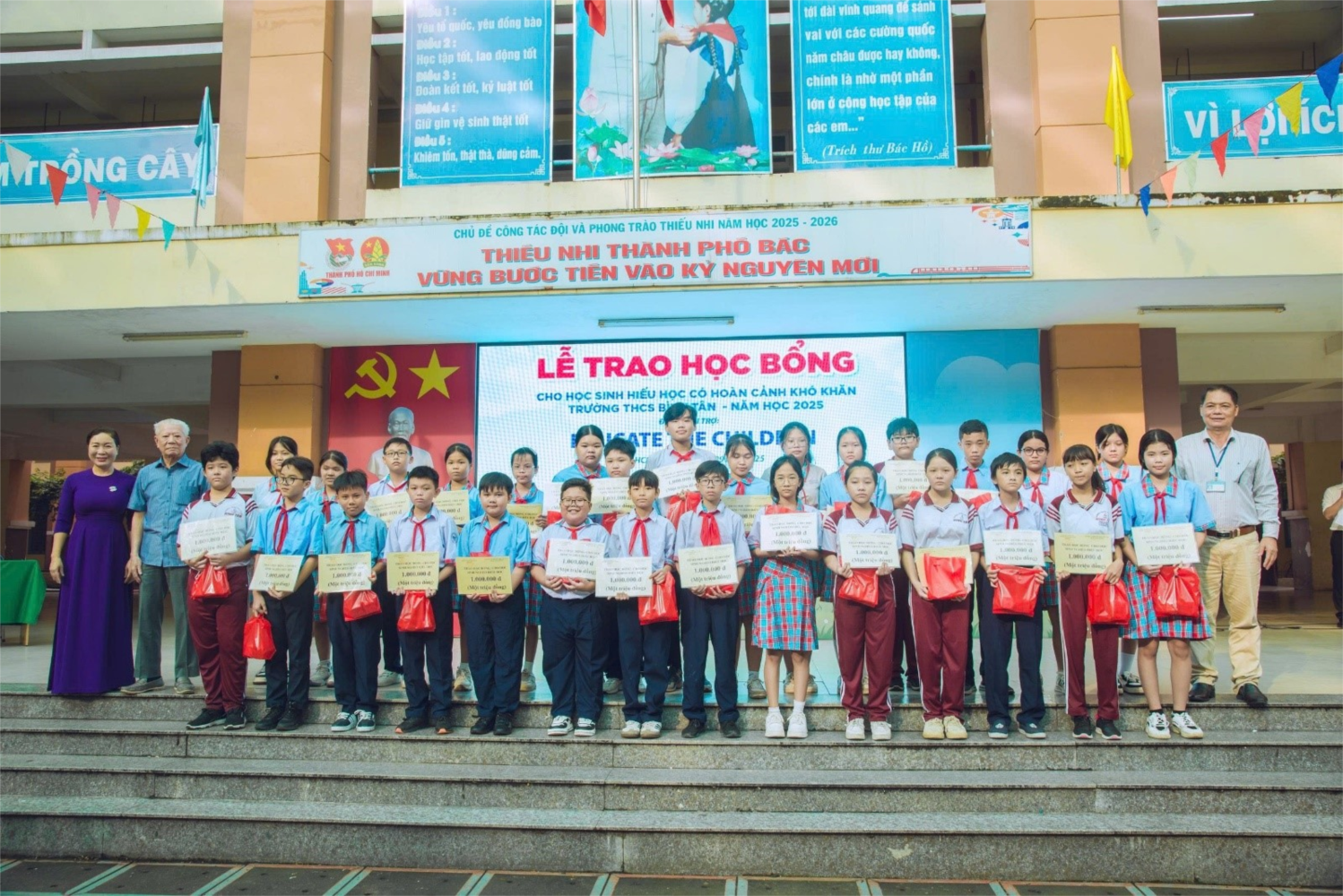Trong không khí hân hoan, tràn đầy nghĩa tình từ các nhà hảo tâm, các mạnh thường quân, sáng ngày 18 tháng 9 năm 2025, Trường THCS Bình Tân phối hợp với Hội bảo trợ bệnh nhân nghèo Thành phố Hồ Chí Minh đã tổ chức chương trình Lễ Trao học bổng cho học sinh có hoàn cảnh khó khăn, hiếu học do giáo dục trẻ em Hoa Kỳ tài trợ thông qua Hội Bảo trợ Bệnh nhân nghèo Thành phố. Đây là hoạt động thường niên, mang đậm tính nhân văn, thể hiện tinh thần sẻ chia, tiếp sức cho những học sinh có hoàn cảnh khó khăn nhưng luôn nỗ lực vươn lên trong học tập. Đặc biệt, sự kiện ngày hôm nay còn được Đài truyền hình Thành phố Hồ Chí Minh – HTV trực tiếp đưa tin về nội dung buổi lễ.