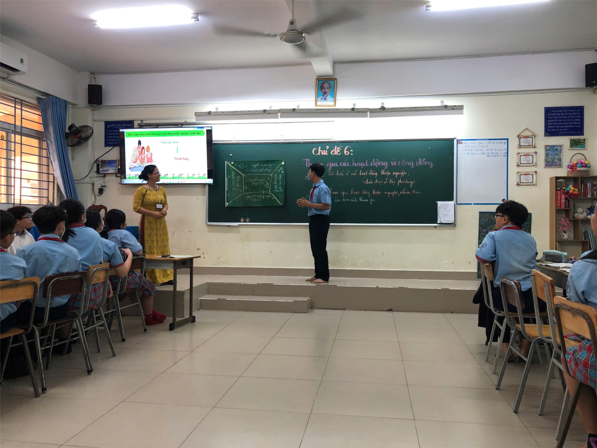 Sau khi cô hướng dẫn các em lựa chọn các hoạt động thiện nguyện phù hợp với điều kiện, hoàn cảnh bản thân để tham gia, các em đã hăng hái, tích cực lên trình bày kết quả thực hành tham gia hoạt động thiện nguyện nhân đạo. Nhóm 1, với video “Kí sự hành trình một ngày làm thiện nguyện” tặng quà cho các em nhỏ mồ côi tại chùa Từ Hạnh trên địa bàn. Xem cách các em chăm chút gấp từng chiếc áo, cẩn thận trao từng bịch bánh cho các bạn nhỏ, mỗi bạn trong lớp đều nhận ra cái Tâm trân trọng và đầy thương cảm trong đó. Nhóm 2, với phóng sự “Một ngày sống xanh”, hoạt động thiện nguyện mà các em thực hiện đó là nhặt rác ngay chính trong khuôn viên trường. Việc phỏng vấn, đã giúp cả lớp nhận ra lợi ích khi tham gia hoạt động thiện nguyện đó là không chỉ niềm vui, niềm hạnh phúc, mà còn là cả những kĩ năng giao tiếp, hợp tác, giải quyết vấn đề mà các em gặp phải. Nhóm 3 thực hiện hoạt động ngay tại lớp với mục đích, để tất cả các bạn hình dung ra tiến trình khi tham gia một hoạt động vì cộng đồng không hề khó. Cuối cùng, đến cả ban giám khảo cũng phải bật cười trước video hành trình thiện nguyện tặng quà cho người vô gia cư của nhóm 4. Cái hồn nhiên, dí dỏm và ngây thơ của các em đã cho cả lớp nhận ra: làm thiện nguyện thật vui và hạnh phúc.