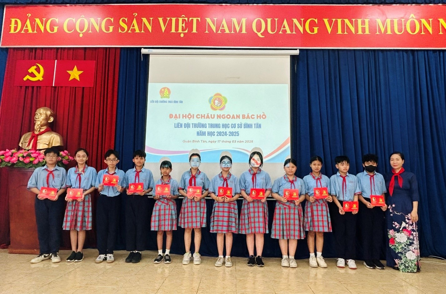 Trong không khí sôi nổi của thiếu nhi thành phố Hồ Chí Minh thi đua lập thành tích chào mừng Đại hội Cháu ngoan Bác Hồ các cấp hướng tới Đại hội Cháu ngoan Bác Hồ toàn quốc năm 2025; Chào mừng kỷ niệm 84 năm ngày thành lập Đội TNTP Hồ Chí Minh (15/05/1931-15/05/2025), 50 năm ngày giải phóng miền Nam thống nhất đất nước (30/04/1975-30/04/2025), 135 ngày sinh Chủ tịch Hồ Chí Minh (15/05/1890-15/05/2025); Chiều ngày 17/03/2025, Liên đội Trường THCS Bình Tân tưng bừng tổ chức Đại hội Cháu ngoan Bác Hồ. Đây là dịp Liên đội tuyên dương các gương Cháu ngoan Bác Hồ là những đội viên, xuất sắc tiêu biểu trong học tập, rèn luyện và tích cực tham gia công tác đội trong năm học 2024 – 2025.