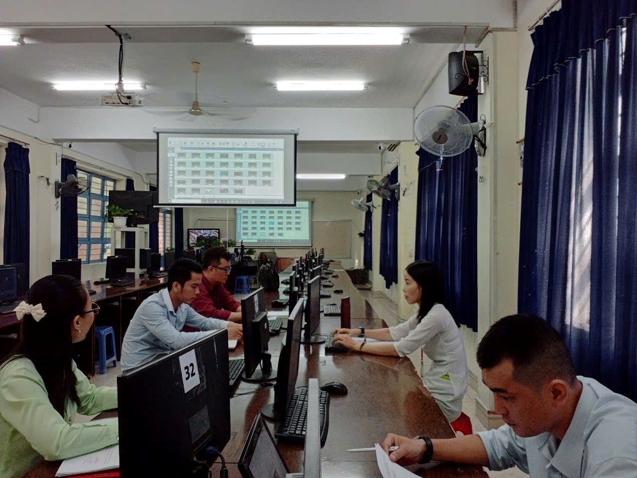 Thầy cô Tổ Công nghệ - Tin học đang sinh hoạt chuyên môn tại phòng Tin học