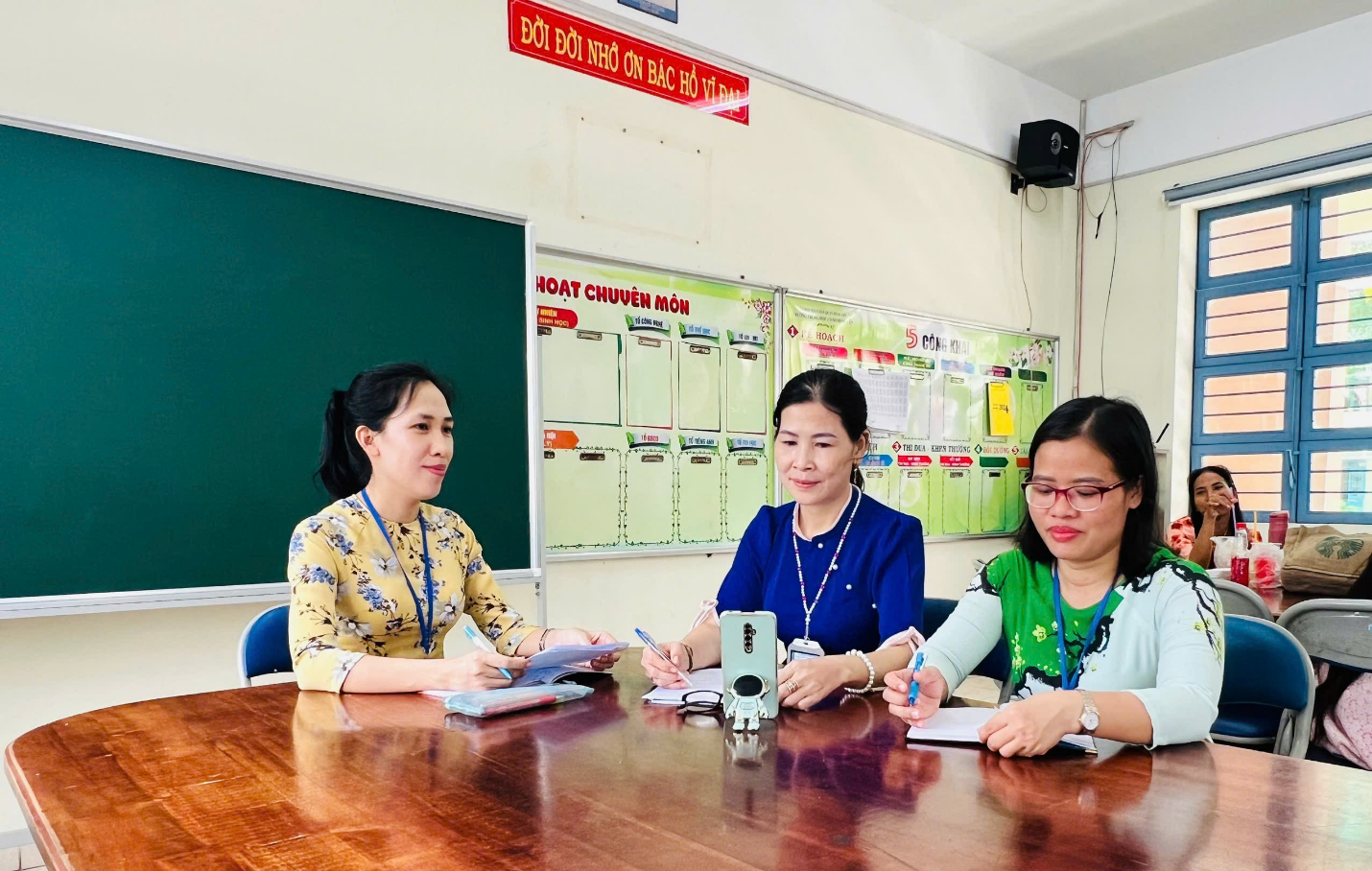 Sau khi thống nhất phân phối chương trình, cô Mỹ Dung phân công soạn kế hoạch bài dạy chung cho các khối nhằm đảm bảo tính thống nhất trong công tác giảng dạy của bộ môn. Cô Lê Thị Cúc đảm nhiệm khối 6, cô Bùi Thị Mỹ Dung đảm nhiệm khối 7, 9 và cô Nguyễn Thị Ngọc Giàu khối 8.