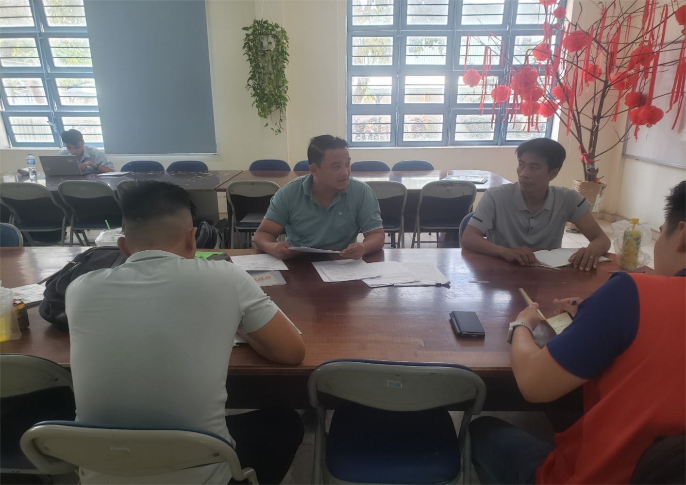 Để chuẩn bị tốt công tác tổ chức kiểm tra giữa học kỳ II theo nội dung ôn tập và kiểm tra giữa học kỳ II năm học 2023 - 2024 của bộ môn Giáo dục thể chất đã thống nhất trong phiên họp trước, tuần này thầy Ngọc Cường đã triển khai lại nội dung tổ chức giữa kỳ II để các thành viên trong tổ nắm rõ và có vài nhắc nhỡ lưu ý về tình trạng sức khỏe học sinh do thời tiết đang càng ngày càng nóng lên dẫn đến học sinh dễ bị sốc nhiệt khi tập luyện ngoài trời.