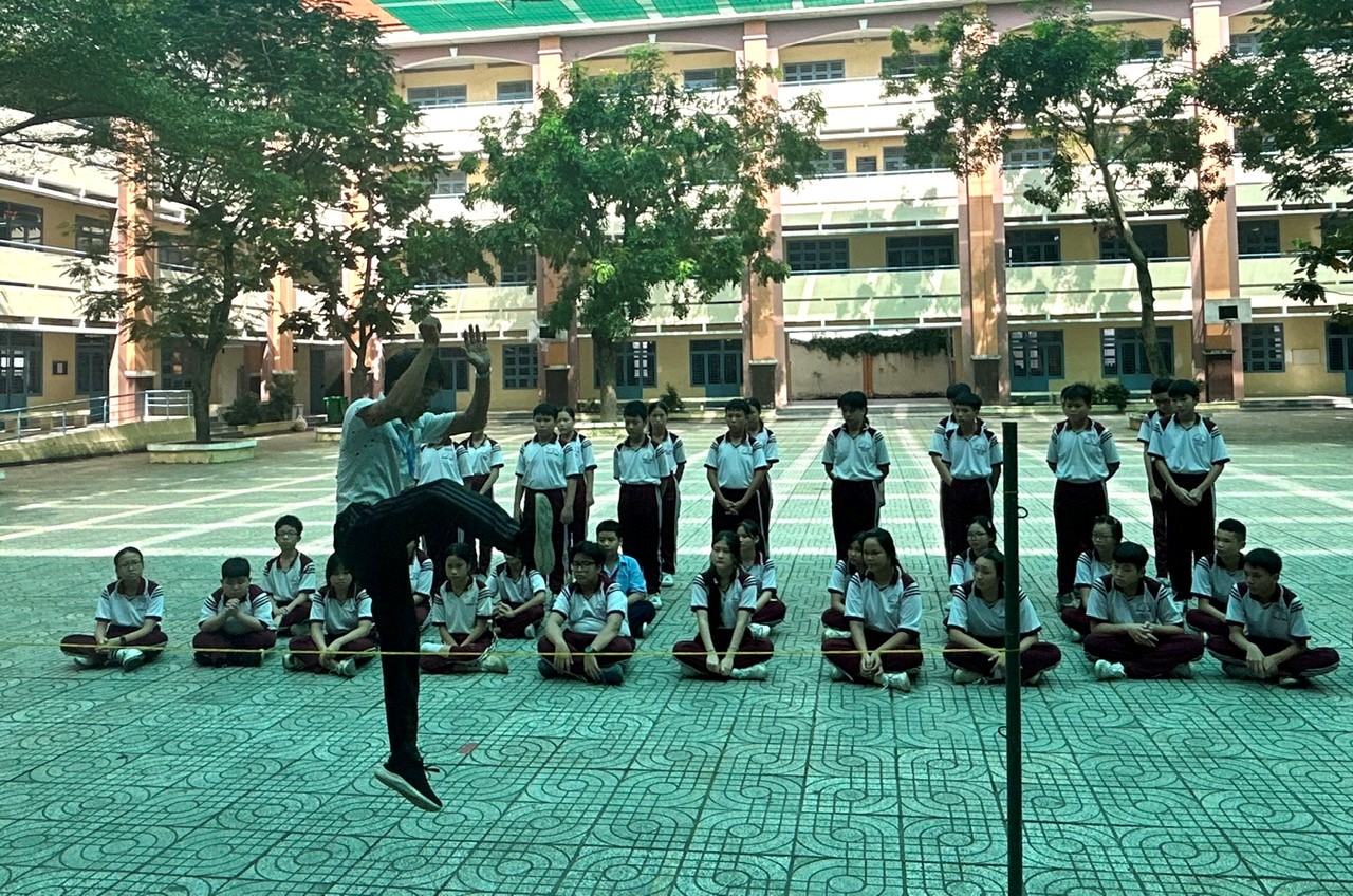 Khi chuyển sang phần trọng tâm, thầy Nguyễn Hơn trực tiếp thực hiện mẫu kỹ thuật chạy đà ba bước – một yếu tố quyết định thành công của kiểu nhảy này. Sau khi quan sát, học sinh được chia nhóm để luyện tập, trao đổi với nhau và tự điều chỉnh tư thế theo hướng dẫn của thầy. Tiết học trở nên rộn ràng, nhưng vẫn giữ được tính kỷ luật và tập trung.