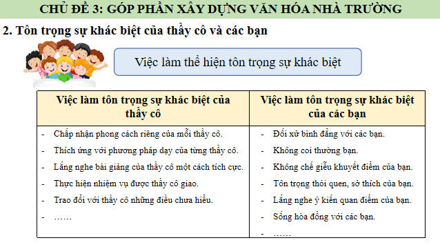 Ở nhiệm vụ 1, học sinh kể tên các hoạt động góp phần xây dựng văn hóa nhà trường và chia sẻ cảm xúc của mình khi tham gia. Đến nhiệm vụ 2, học sinh thảo luận nhóm về những việc làm thể hiện sự tôn trọng sự khác biệt giữa thầy cô và bạn bè, từ đó đưa ra các cách ứng xử phù hợp trong đời sống học đường. Tại nhiệm vụ 3, học sinh làm việc theo nhóm đôi để trao đổi về cách sống hài hòa, thể hiện sự đồng cảm và chia sẻ trong các tình huống cụ thể. Cuối cùng, ở nhiệm vụ 4, học sinh tham gia trò chơi “Ai nhanh hơn” để nhận biết các hành vi bắt nạt học đường, sau đó cùng thảo luận, lập kế hoạch phòng chống bắt nạt học đường và bình chọn kế hoạch khả thi nhất thông qua hình thức giơ thẻ màu. Các hoạt động được thiết kế sinh động, mang tính thực tiễn cao, giúp học sinh không chỉ hiểu mà còn thực hành kỹ năng ứng xử văn minh, nhân ái trong môi trường học đường.