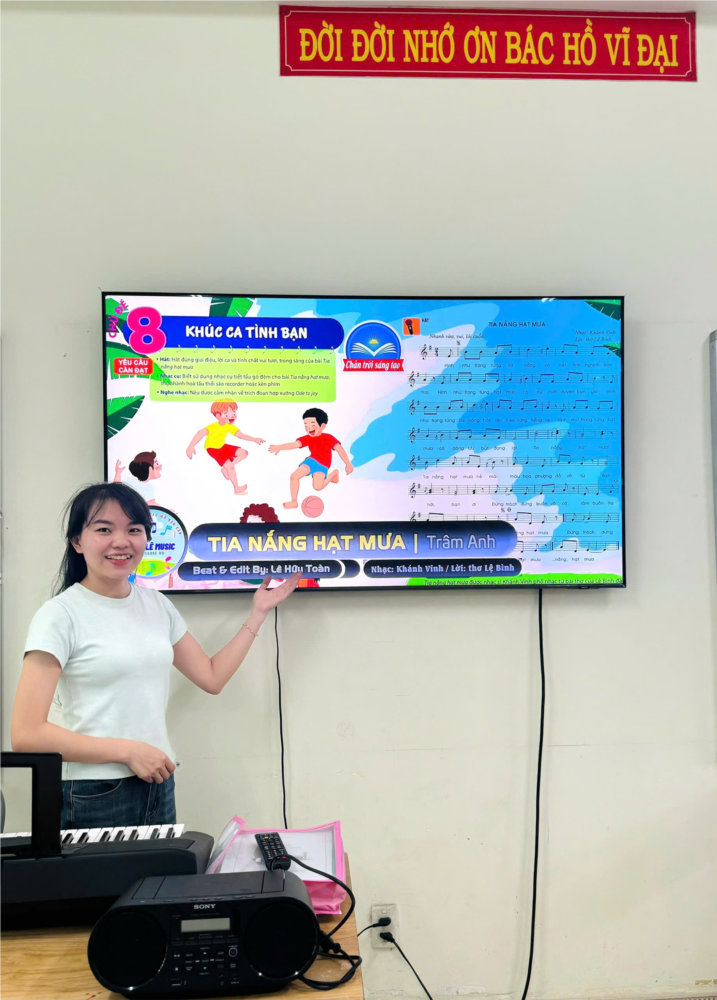 Một phần quan trọng và đặc sắc trong buổi họp là hoạt động trao đổi chuyên môn thông qua tiết dạy minh họa của cô Nguyễn Ngọc Ngân với chủ đề “Khúc ca tình bạn”, nội dung học hát bài “Tia nắng, hạt mưa”. Với giai điệu nhẹ nhàng, ca từ vui tươi và gần gũi, bài hát đã giúp học sinh cảm nhận được vẻ đẹp trong sáng, hồn nhiên của tình bạn. Tiết dạy không chỉ mang đến không khí tươi vui, hứng khởi mà còn thể hiện sự đầu tư trong phương pháp sư phạm, lồng ghép khéo léo giữa giáo dục thẩm mỹ và giáo dục nhân cách cho học sinh, truyền tải thông điệp về tình yêu thương, sự đoàn kết và sẻ chia giữa bạn bè.